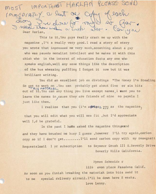 Harlan Ellison tells Robin Williams stories about ghost writing a Lenny Bruce column called Bruce…